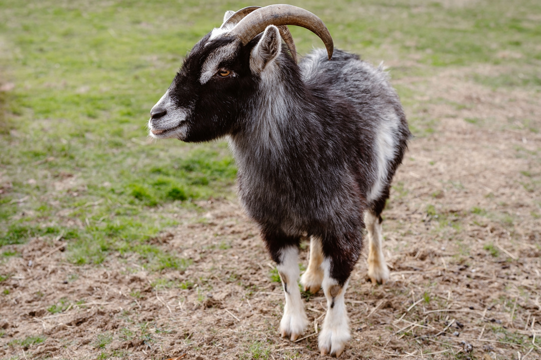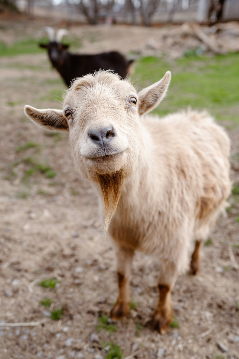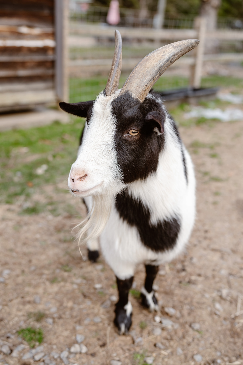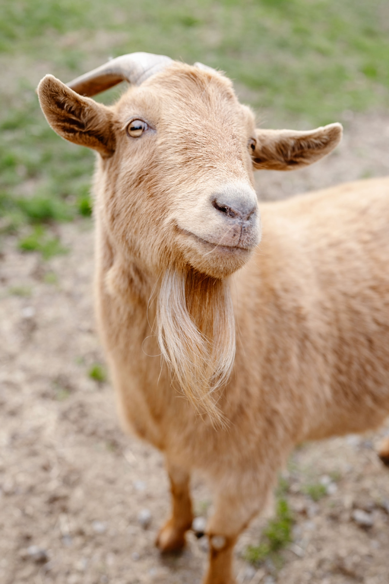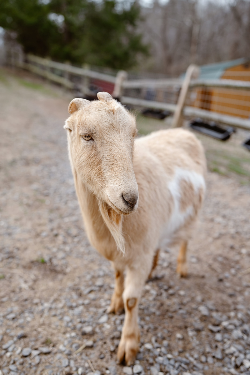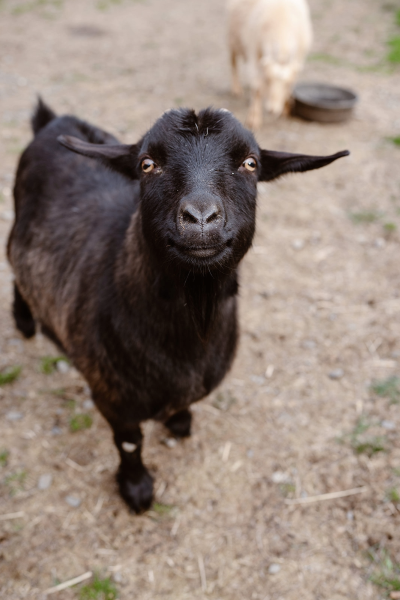 Shorty is our smallest goat. Shorty, a pygmy goat, was found wandering with no owner. Small in size but big in personality, he is always first in line for food and will wiggle and head butt his way through the goat herd for attention.