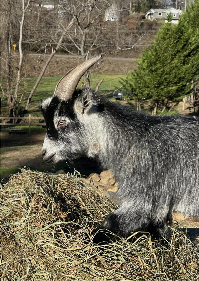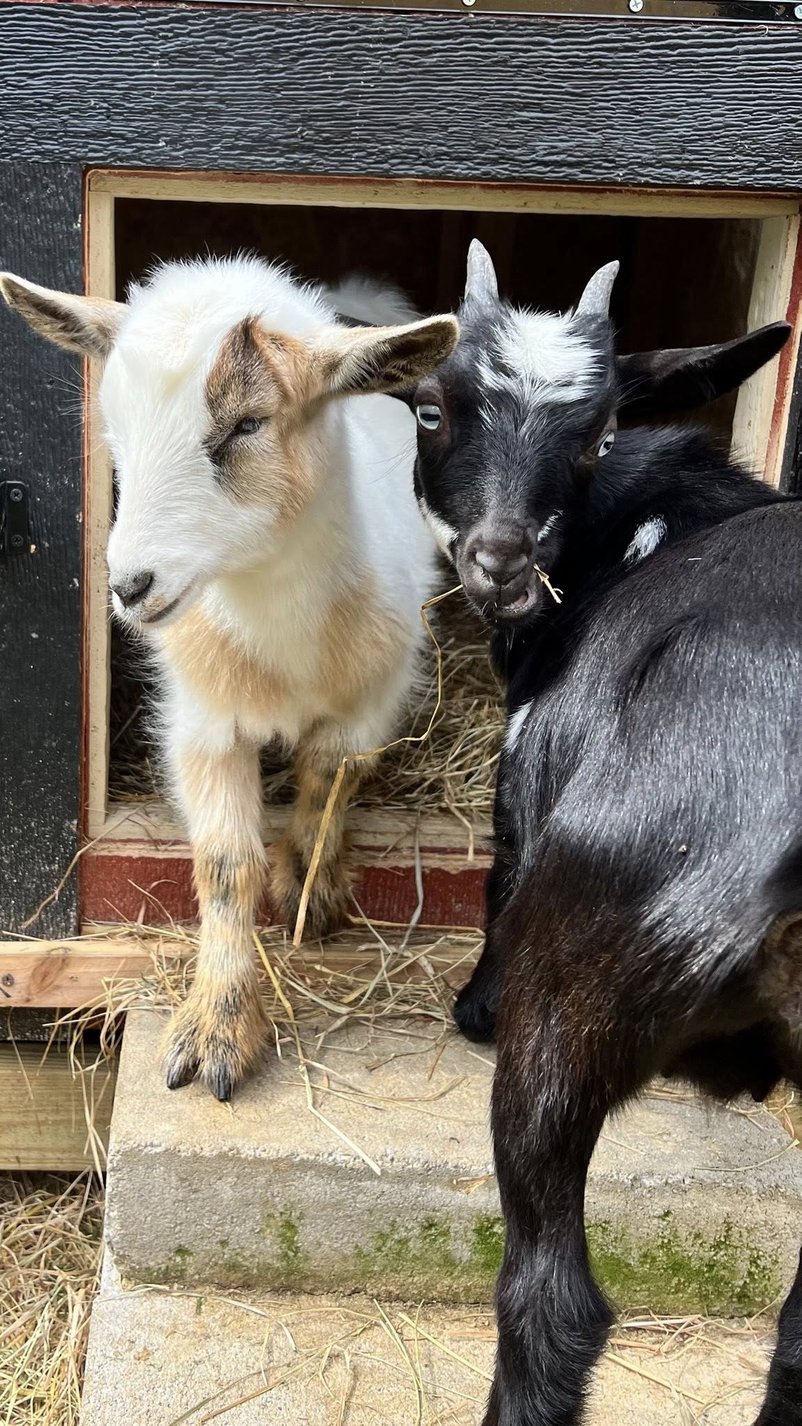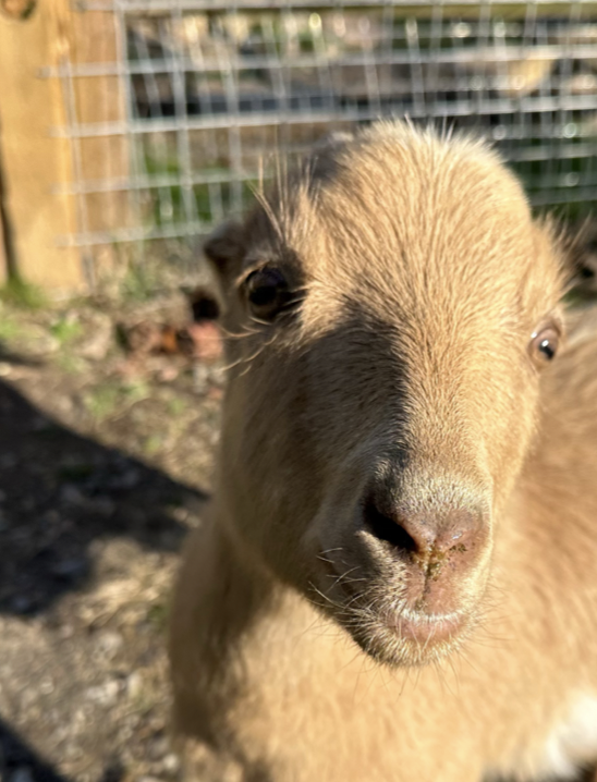KC was found shivering under a carport during a rainstorm. When no family came forward, she became part of our herd. We were looking for a friend for Jingles and KC came at the perfect time. Her name, short for Karma Chaos, fits perfectly. It was karma that she found us, and chaos to suddenly have two baby goats in Trina’s house. KC is mischievous and full of energy, once even jumping onto Trina’s dining room table. Together, these two are learning side by side, proving that friendship makes every challenge easier.